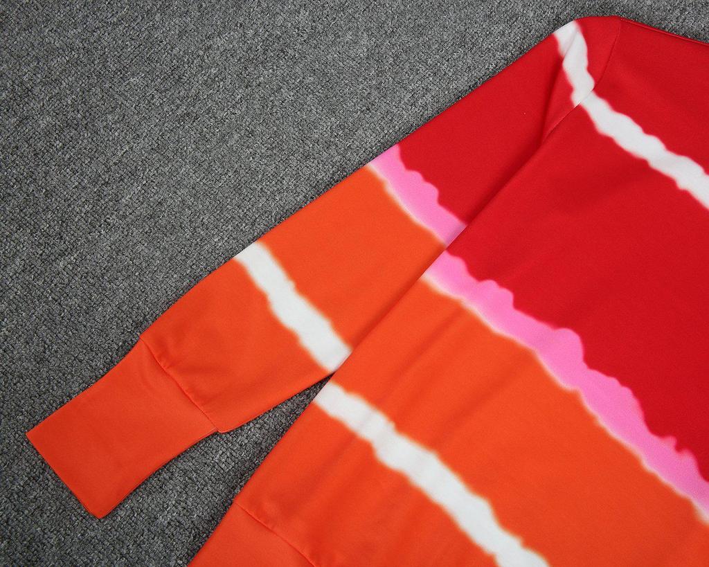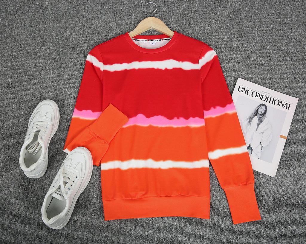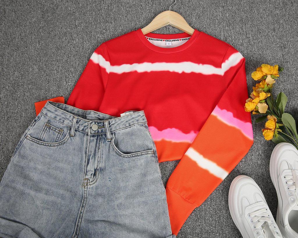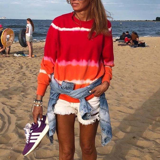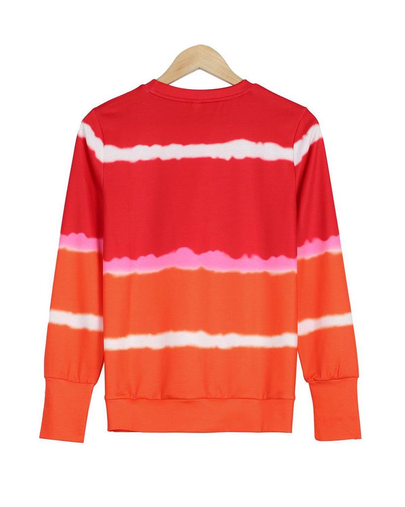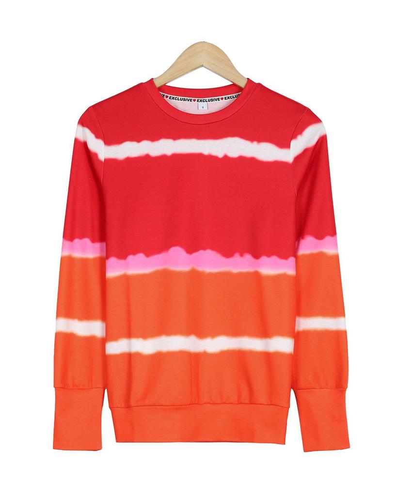 Live the high life whether at home or a private beach in this comfy, modern sweatshirt. Colorblocked in fiery red and orange, the pullover has super trendy shibori-style stripes. Wear the sweatshirt with white jeans in the summer months and carry it into fall tucked into a midi skirt.