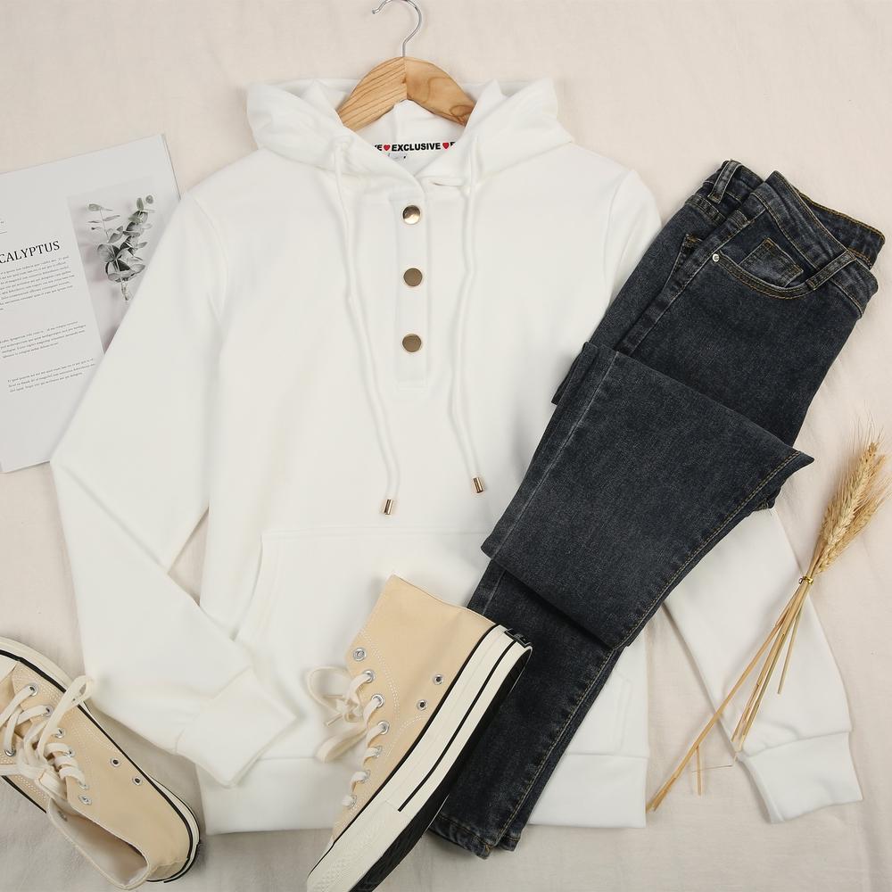 Currently loving—and living in—this very hoodie. The white sweatshirt is styled with a comfy hood, slouchy sleeves and kangaroo pockets with golden buttons at the neckline and a hardware-tipped drawstring. It’s the most comfortable and casual of style options, but the gilt touches lend a luxurious-looking touch.