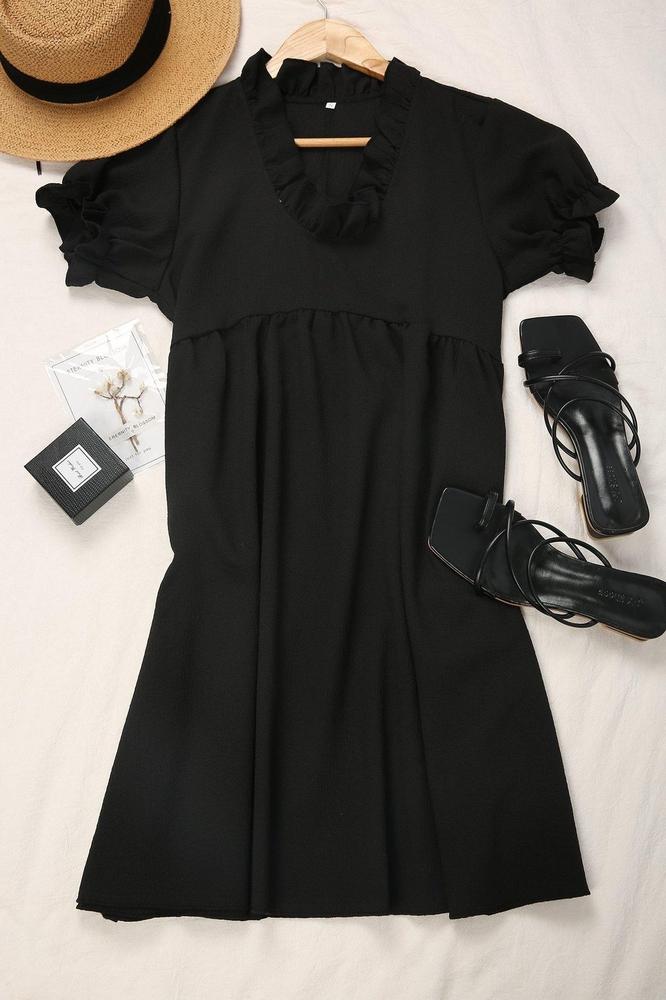 You can never have too many little black dresses—especially when they’re casual enough to wear for daytime and dressy enough to wear to a dinner date. Textured with plisse pleats and trimmed with ruffles at the neckline and short sleeves, this fully-lined black crepe dress is anything but dull.