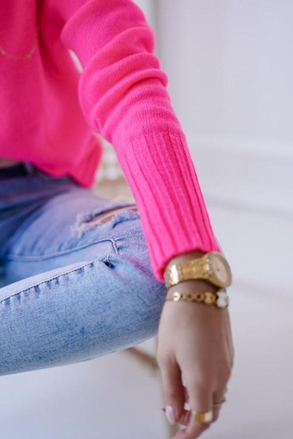Don’t get cabin fever wearing winter blues and blahs. This soft knit in designed in vivacious hot pink-hued fabric that works wonders as an instant mood lifter. It’s classically styled with a ribbed turtleneck and extended ribbed cuffs. Cute dressed up or down, pair it with a slip skirt and heeled booties or baggy denim and sneakers.