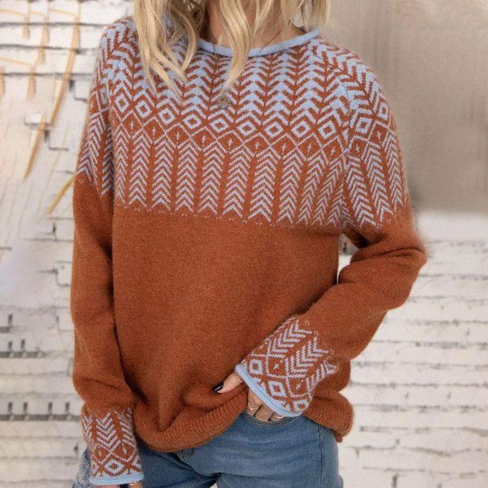 Fight winter wind chills in this cozy sweater. Great for an alpine getaway or a cabin rental vacation, the cinnamon-hued sweater is spun from soft fibers and designed with a powder blue pattern and rolled edges. We love the warm and rich and frosty and light color contrasts. Wear yours for downhill sledding with a pom-pom hat, puffer coat and corduroys.