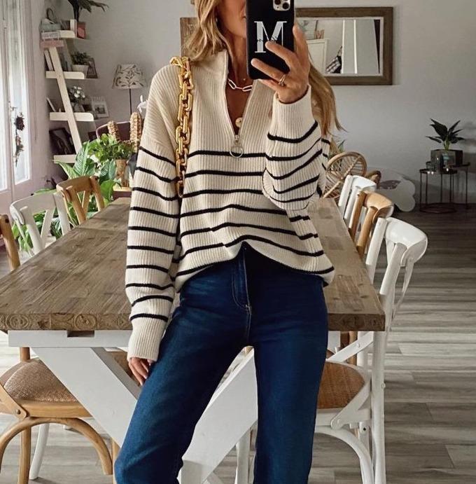 Cool Zipper V-Neck Long Sleeve Striped Sweater