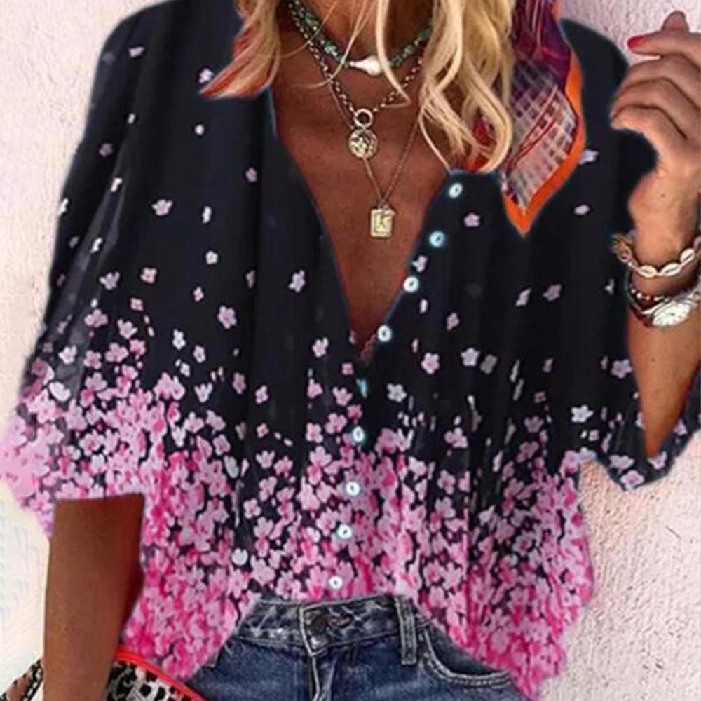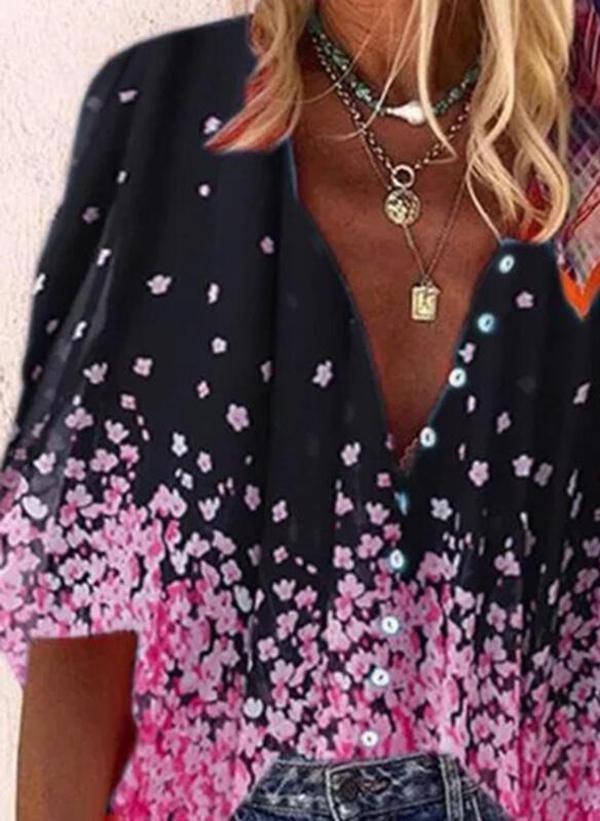 Elegant Floral Print 3/4 Sleeve Black Shirt