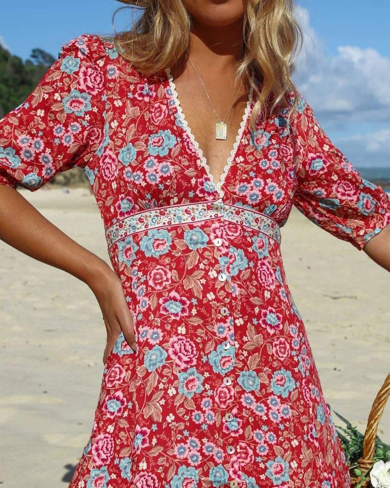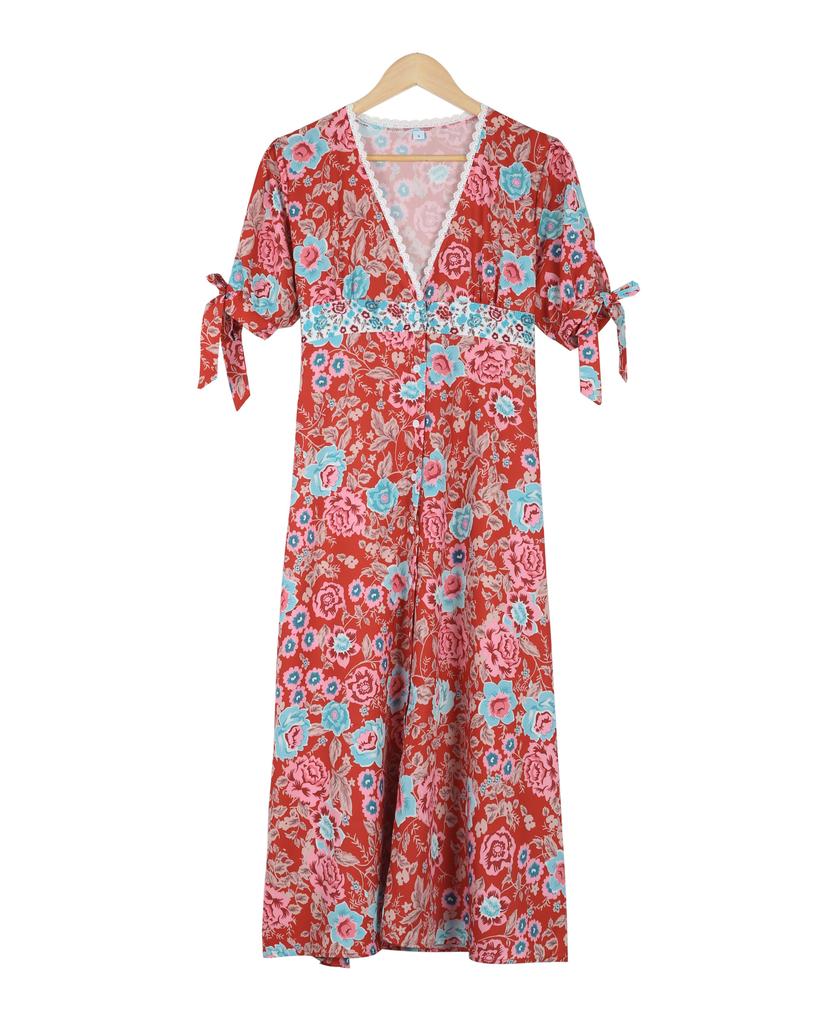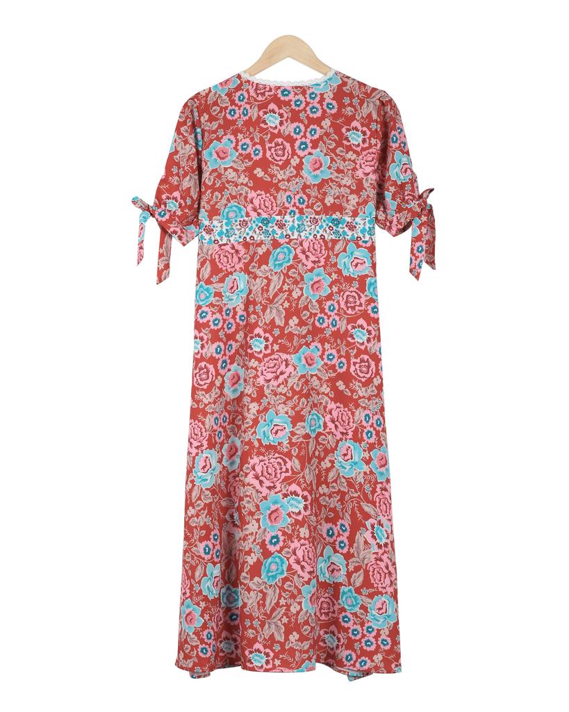 Elegant Floral Print Empire Waist Short Sleeve Midi Dress