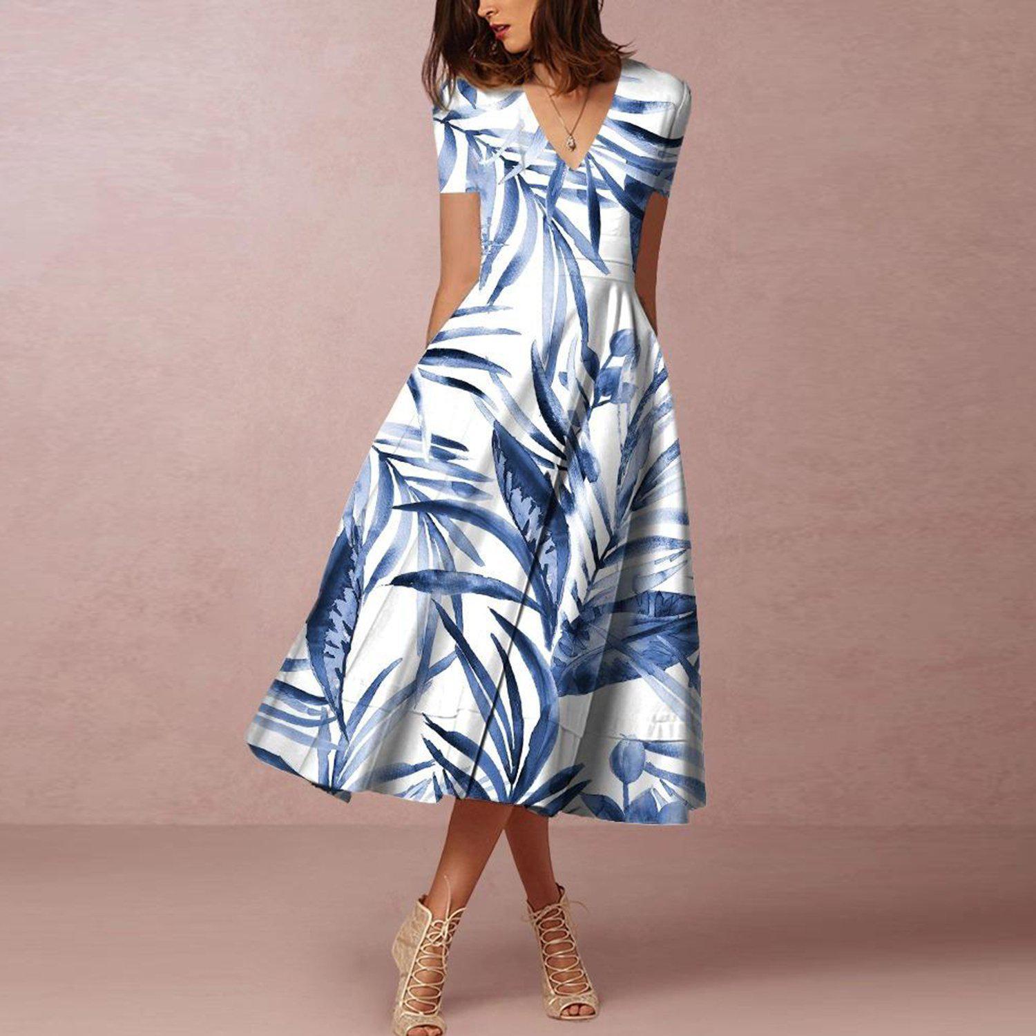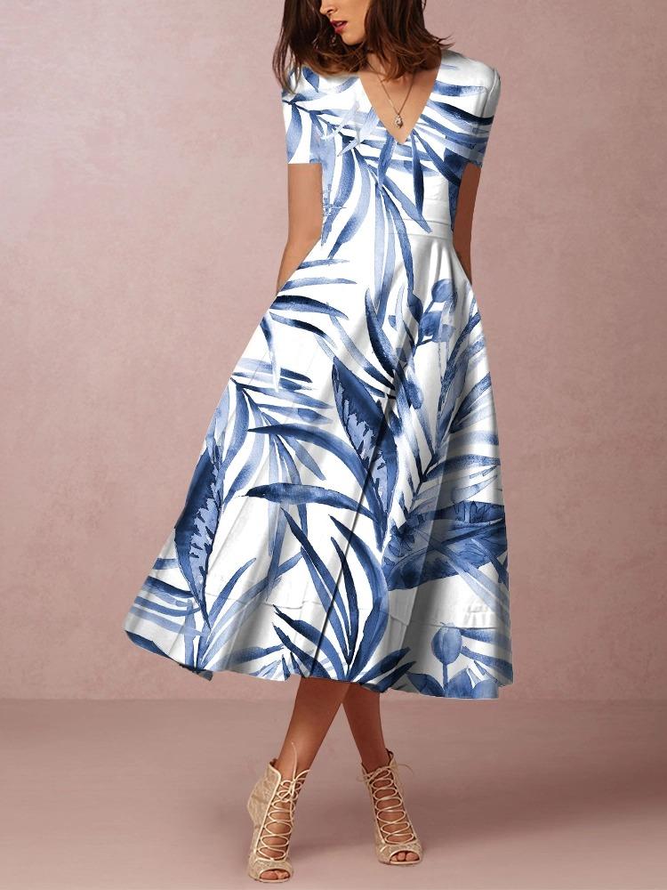 Elegant V-Neck Print Midi Dress