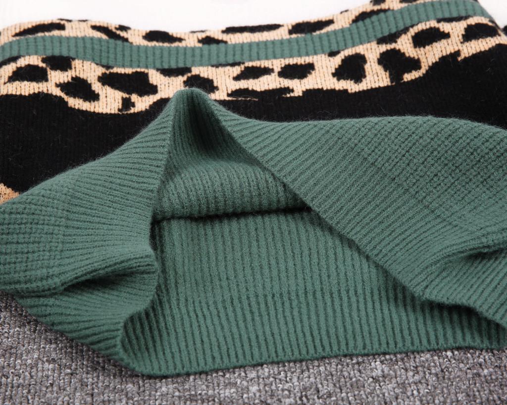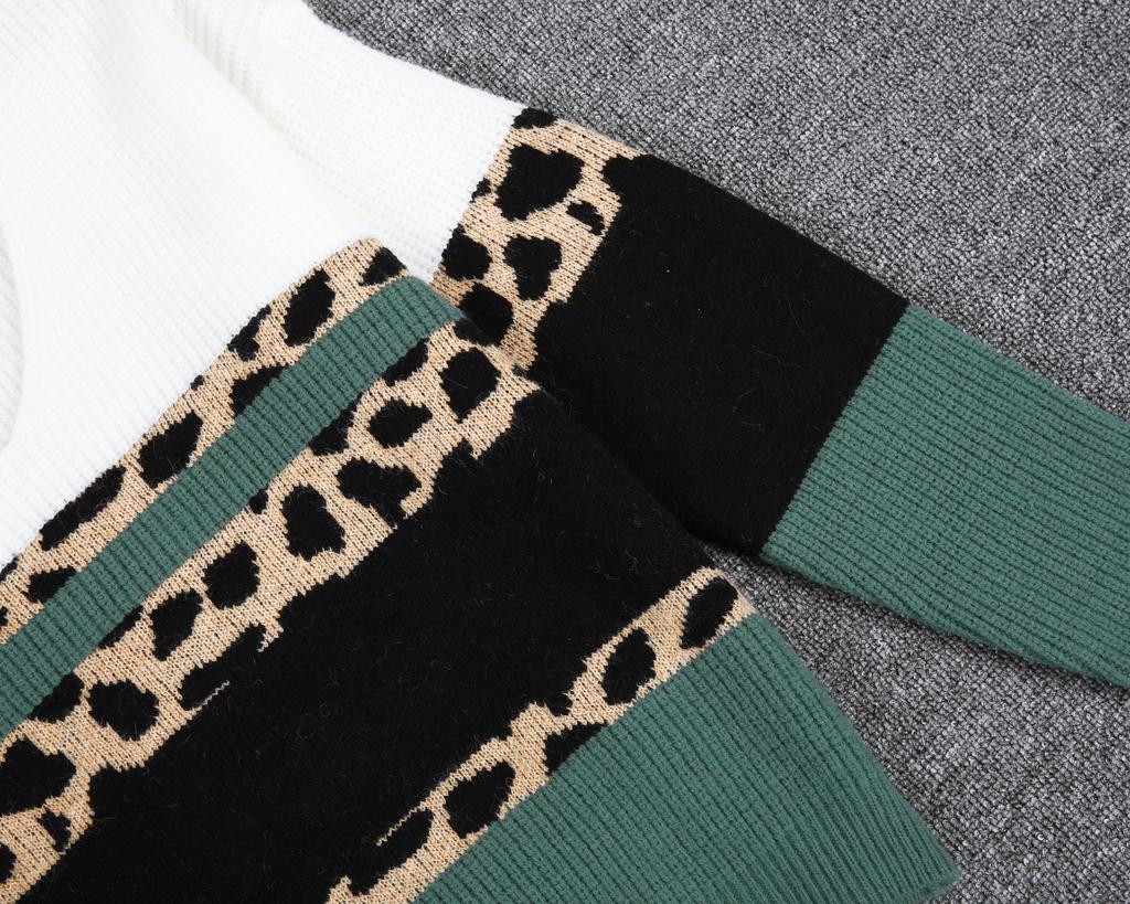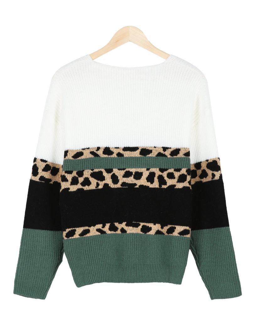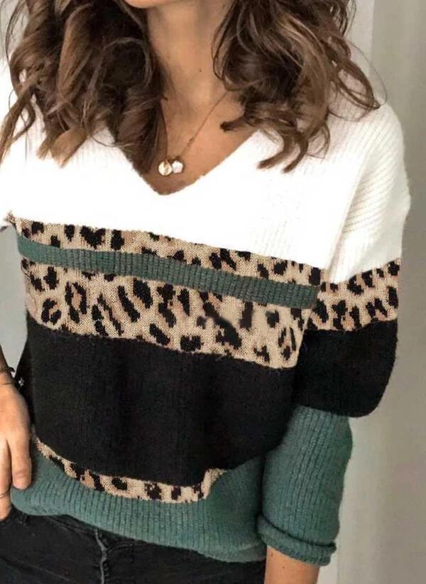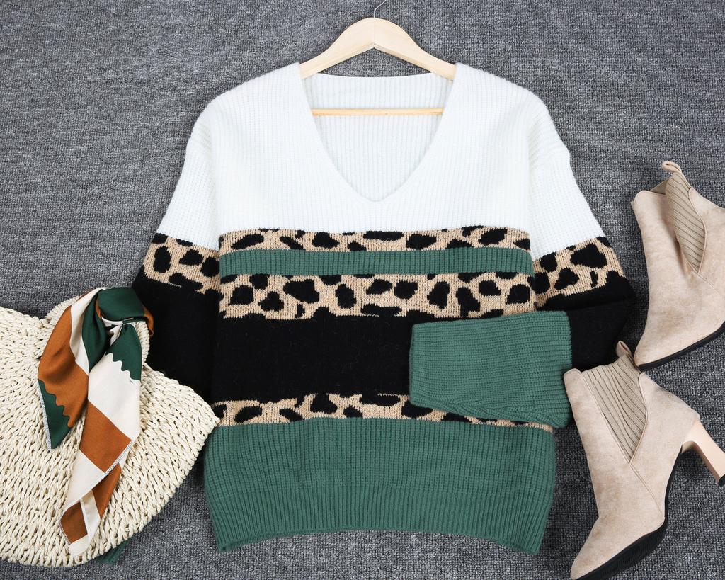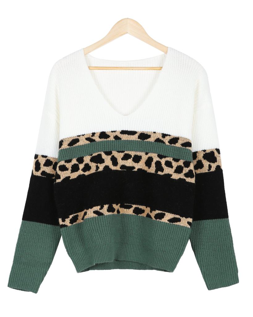Add this trendy knit to your winter line up for a more-is-more addition. Colorblocked with ribbed black, white and evergreen panels, the sweater is also designed with blocks of stylized leopard knit. The sweater has a contemporary V-neckline and long sleeves that look cute cuffed thanks to soft, stretchy fabric.