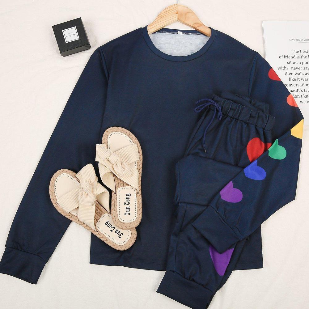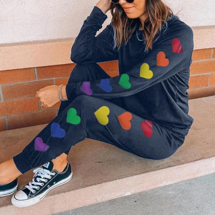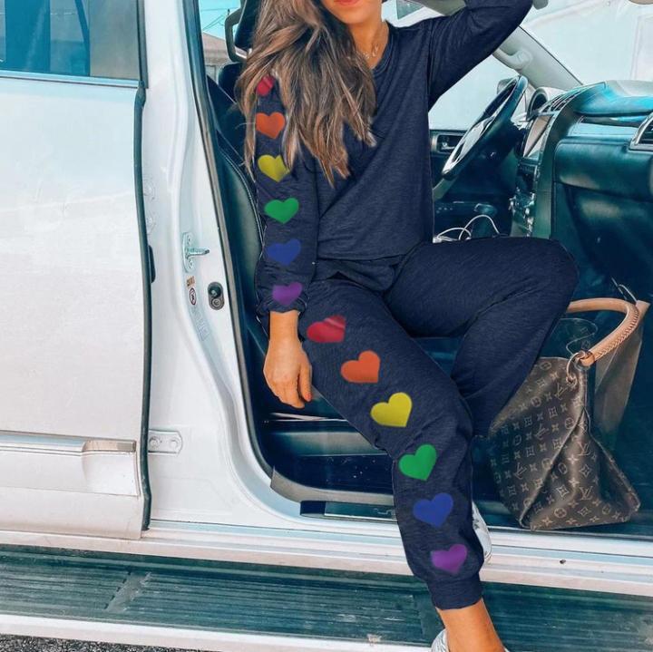 Raise your hand if you “heart” comfort! Topping the list of things we love is this fashionable set that includes a long-sleeve tee and drawstring-waist joggers. Cozy yet lightweight, this set makes the perfect loungewear for any season. It’s printed with rainbow hearts down the sleeve and leg that add a playful touch to the otherwise all black pieces.