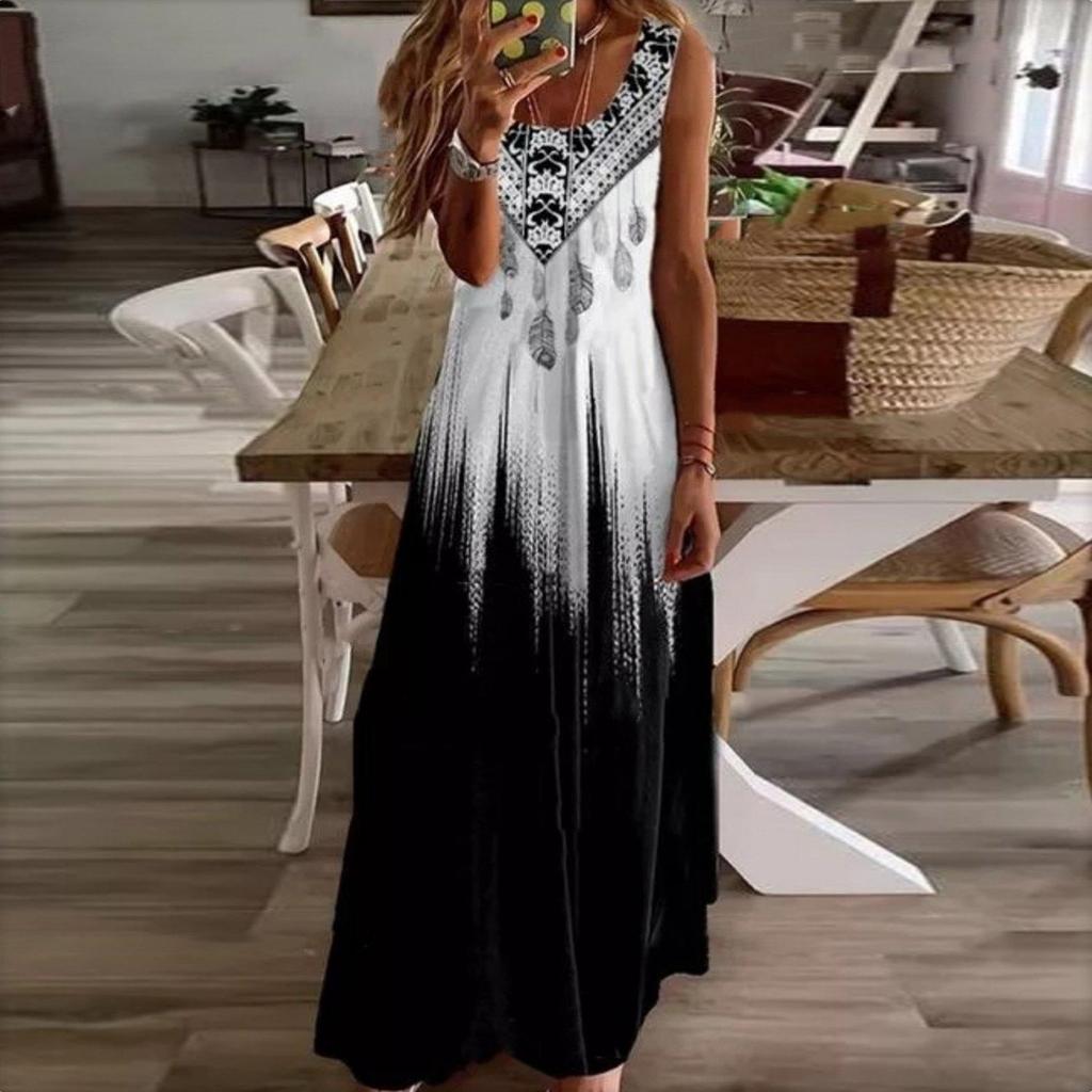 A true goddess knows their worth. Go dramatic with a Grecian inspired maxi dress for the beach or nightlife to create a breezy style. The sleeveless style features an intricate printed neckline with a droplet design and an a full ombre skirt.