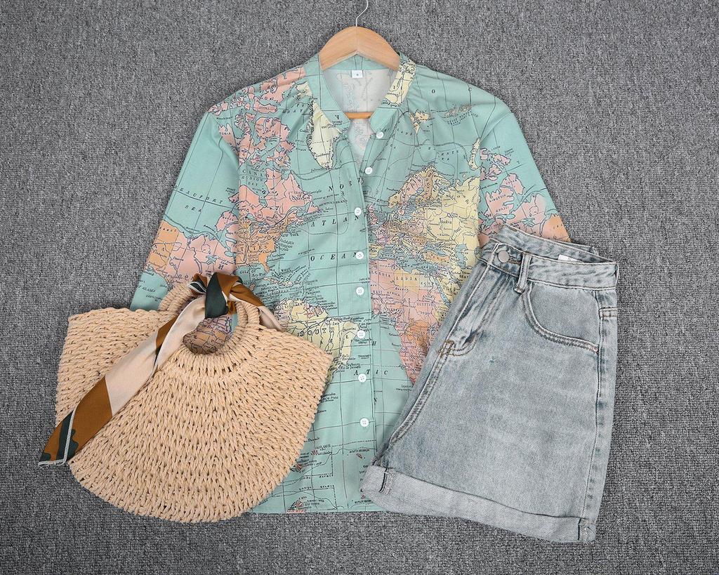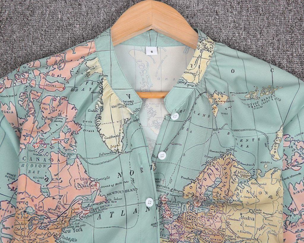 The definition of global fashion, this button-front blouse is designed with long sleeves and printed with a map of the world! Let it call to mind memories of your favorite vacations and inspire new adventures. Tuck it into straight-leg denim and add comfy sneakers.