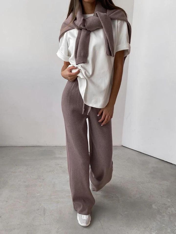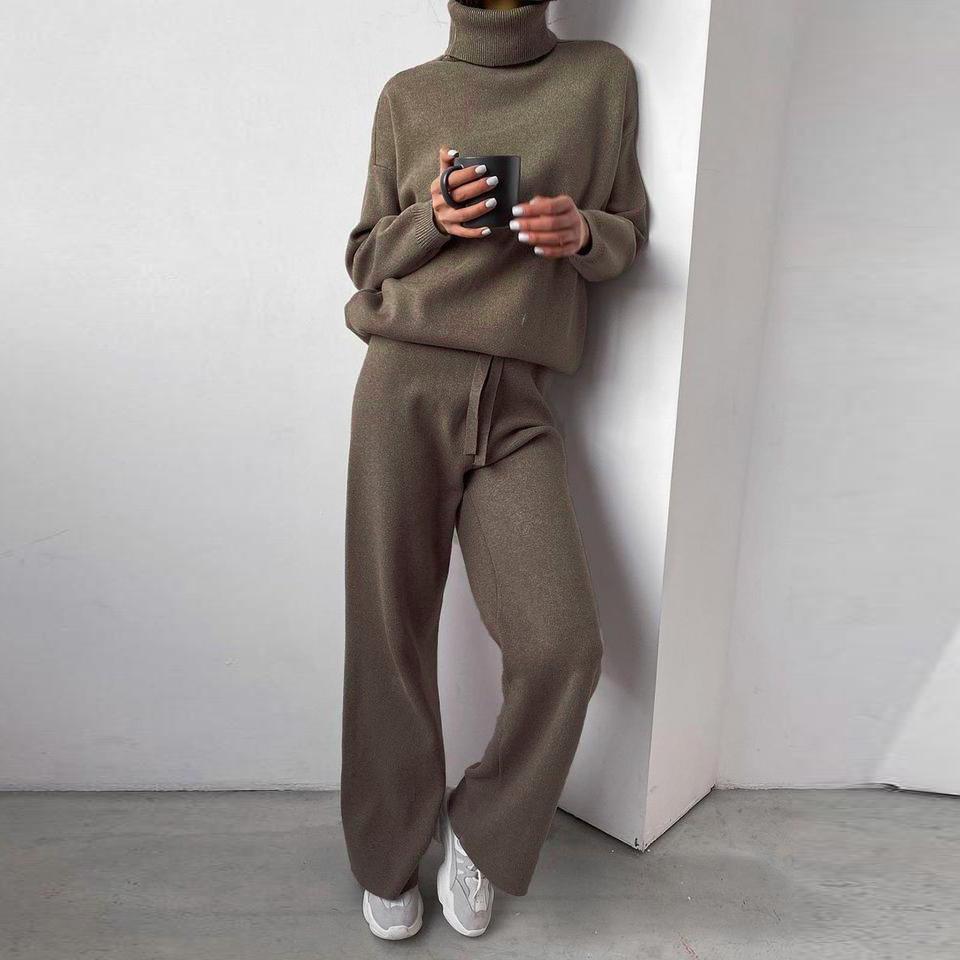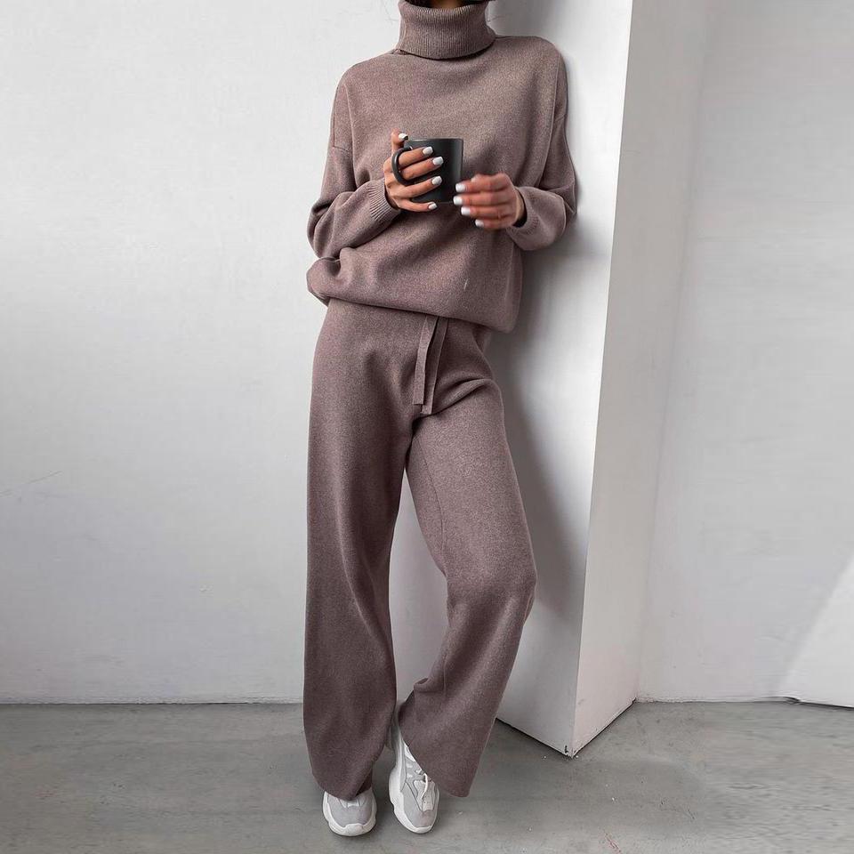 Ultra-chic yet effortless, this knit set takes loungewear to a new level. As comfortable as pajamas, the monocolor two-piece looks like it was pulled straight from the runway. The laid-back glam style features a sweater with a ribbed turtleneck and dropped shoulders and drawstring pants with a gently flared leg.