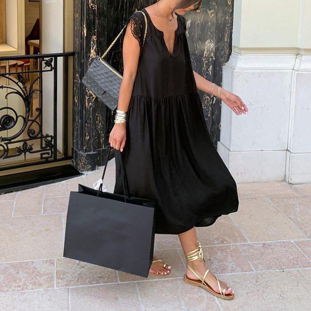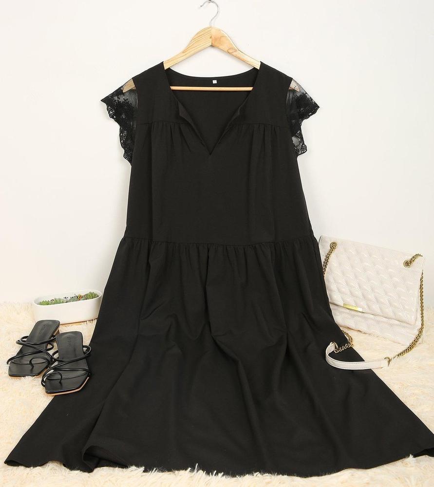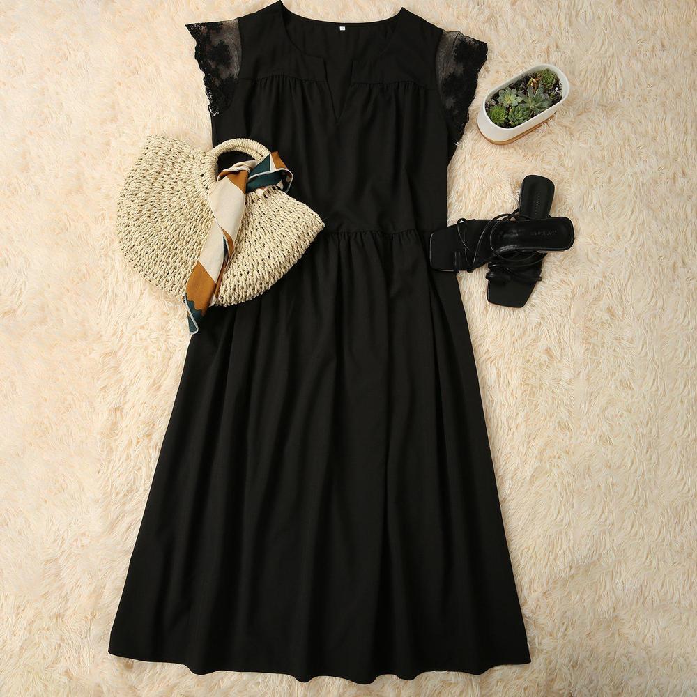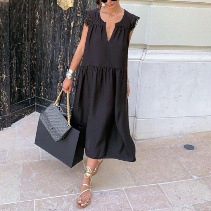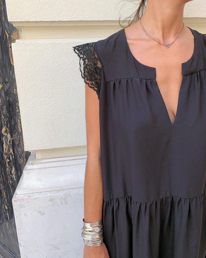 Grab the keys, we’re going out! Don’t miss an opportunity to show off this dress that’s as comfortable as it is elegant. The tiered dress is cut with a split neckline and trimmed with lace at the shoulders for delicate cap sleeves. It’s so pretty with a crystal-embellished watch and a quilted bag.