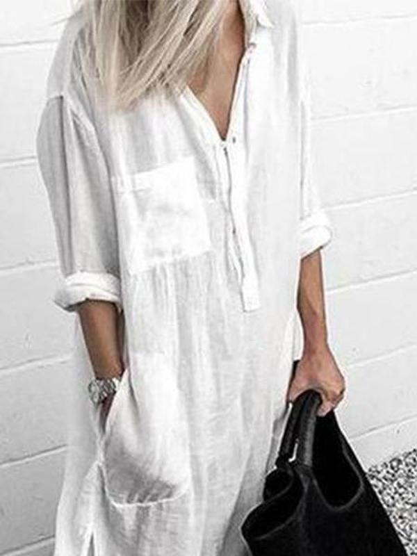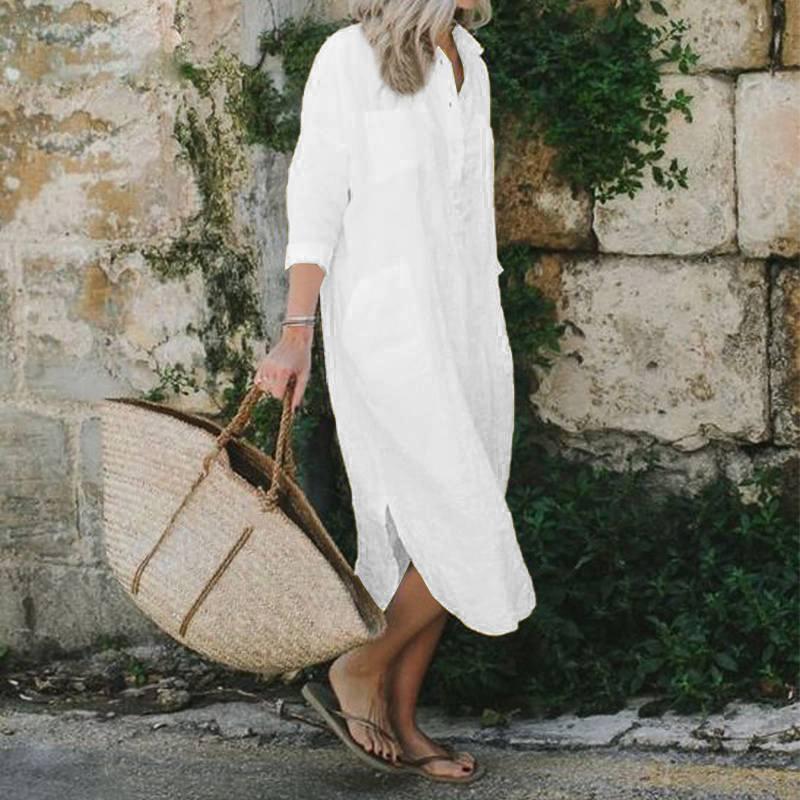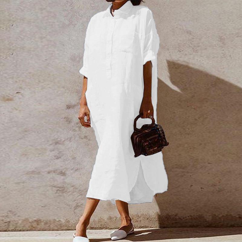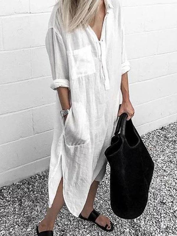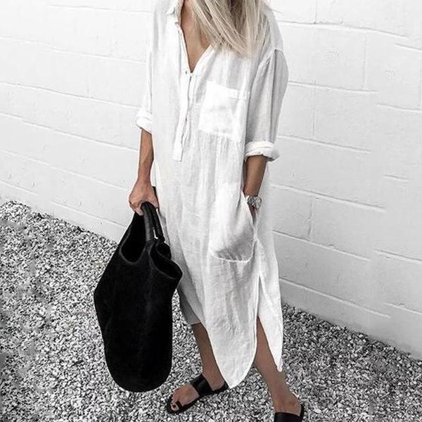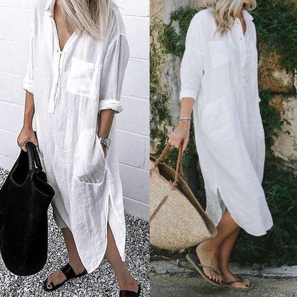 Made for fashion minimalists, this white dress has the appeal of an elevated basic you can wear here and there. It’s styled with a spread collar, buttons at the neckline, a chest pocket and roomy patch pockets that can hold a hotel key or lip gloss. The rounded hem is finished with split seams. Throw it and go for instant polish walking the dog or strolling down the boardwalk.