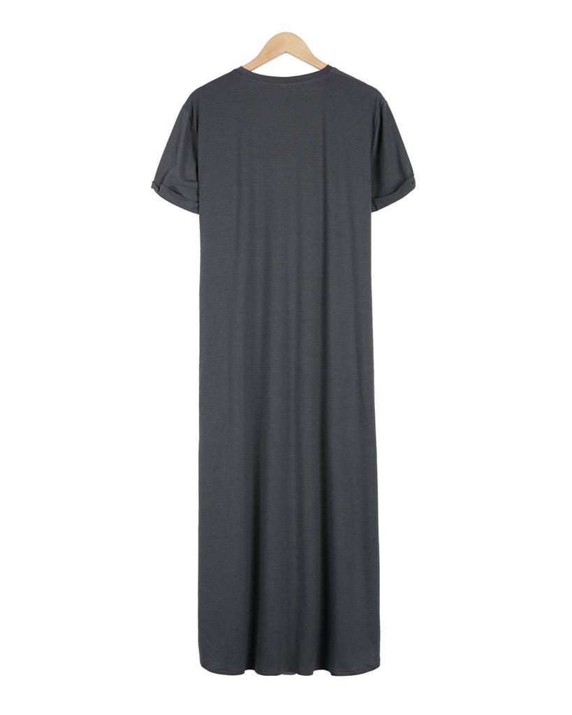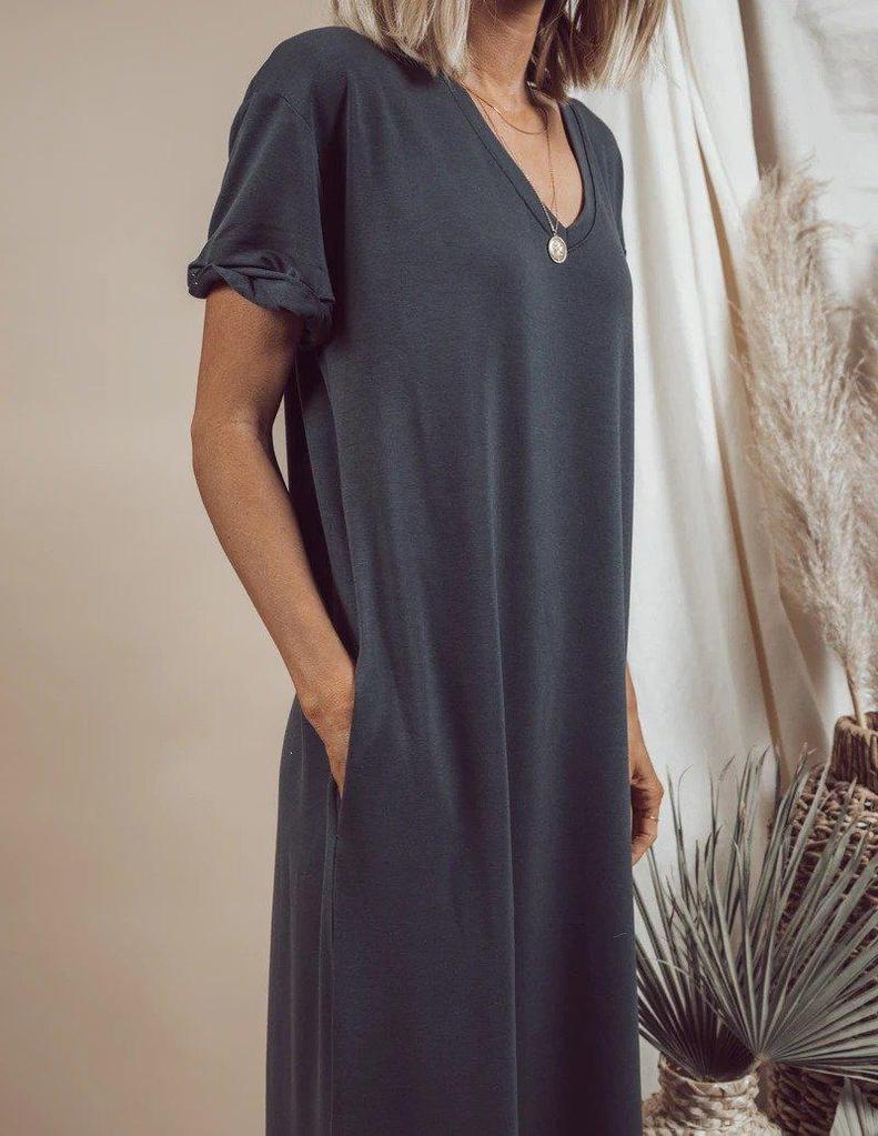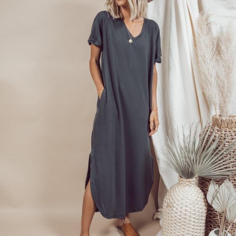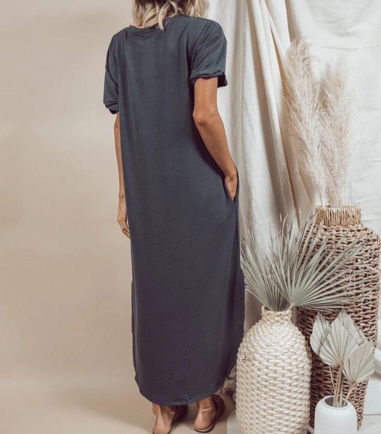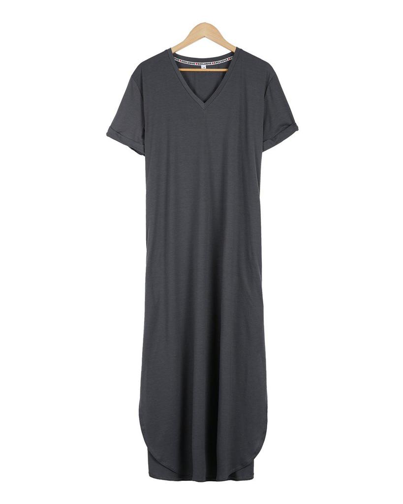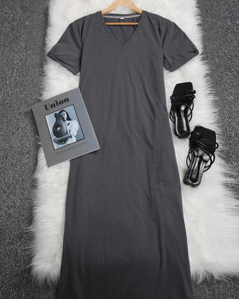 Simple Plain V-Neck Side Pocket Maxi Dress
