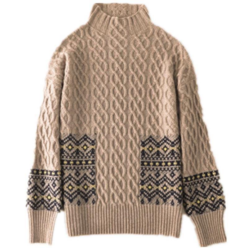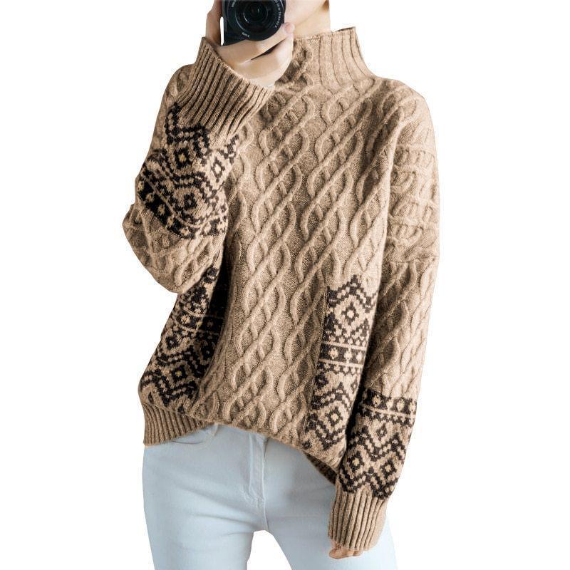 Stylish High Neck Cable-Knit Long Sleeve Printed Sweater