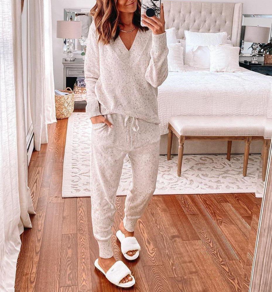 A super cute pullover and matching set? Count us in! Get in the spirit of cold weather and cups of cocoa with this matching set you can wear out and about or to bed. This pale grey set has a speckled pattern with ribbed banding on the top and pant cuffs. The warm pullover is designed with a prominent V-neckline and the soft pants have a pull-on waist and cozy pockets.