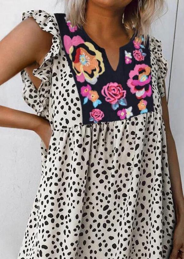 Fierce (and fiercely loved) like an animal, sweet like a flower. You’re funny, confident and cool—the one everyone wants in their circle. Cut with a round, notched neckline, the shift mixes punchy dalmatian dots with neon blossoms at the yoke. Flutter sleeves and a gathered empire waistline give it a cute, fresh feel.